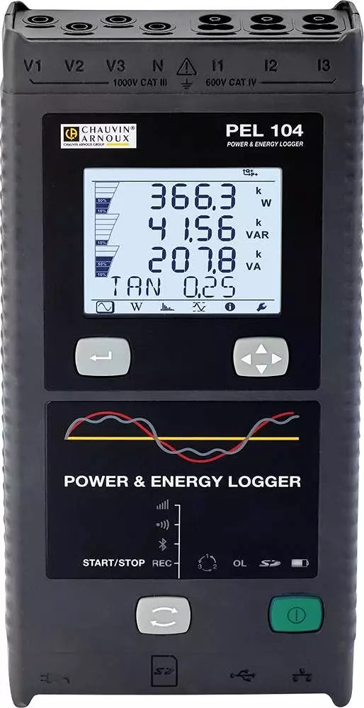 PEL 104 – Triphasé – Mesure, enregistre, calcule et affiche des valeurs pour les bilans énergétiques (tensions, courants, puissances, énergies).