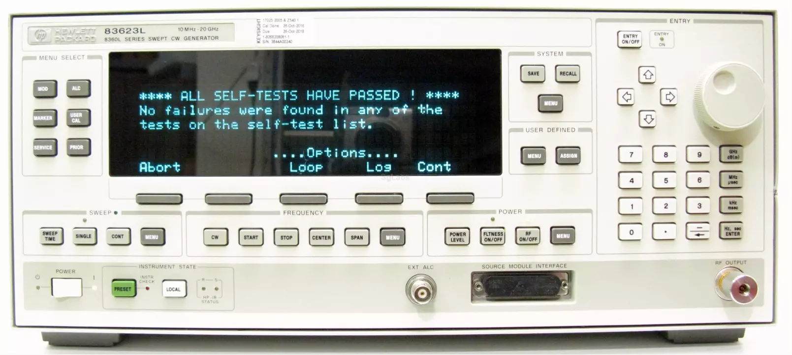 Générateur synthétisé (2 GHz) 10 MHz à 20 GHz, modulations AM/FM/ΘM/Pulse, entièrement programmable GP-IB. 10 MHz à 20 GHz (avec option 4), Bruit de phase -110 dBc/Hz (@1 kHz offset @10 GHz), Niveau de sortie +17 dBm à 20 GHz, Atténuateur (option 2A), Modulations AM/FM/phase et d’impulsions en option, Programmable GP-IB.